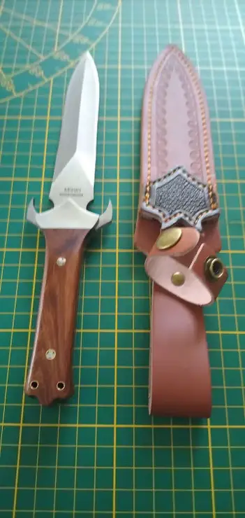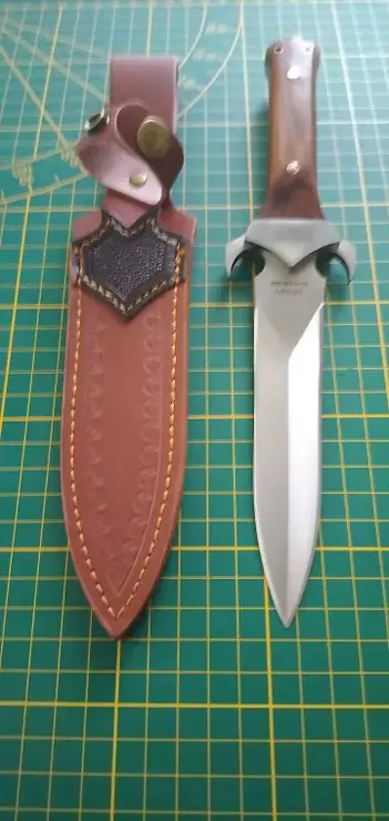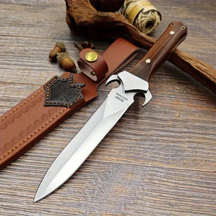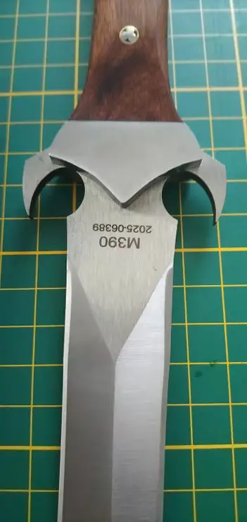 Cuțitul, Sabie cu dublu tăiș, lama din oțel M390 este o mărturie a uniunii dintre măiestria străveche eleganța naturală. Lama, forjată meticulos, nu numai că oferă o ascuțire și durabilitate excepționale, ci și evidențiază măiestria tehnicilor tradiționale de prelucrare a oțelului. În completarea acestei lame este mânerul realizat din lemn de tranadafir oferind o combinație de stabilitate, confort și un aspect distinctiv din punct de vedere vizual, care face din acest cuțit cu lamă fixă o operă de artă funcțională pentru pasionații de aer liber.