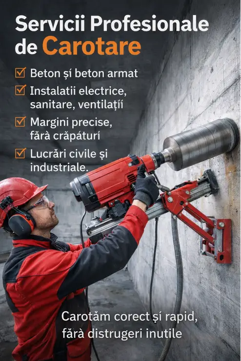 Oferim servicii complete de carotare cu echipamente moderne si operatori calificati, gata sa execute lucrari de orice complexitate. Experienta noastra ne permite sa intervenim atat in proiecte mici, cat si in santiere mari, respectand intotdeauna standardele de siguranta si calitate.