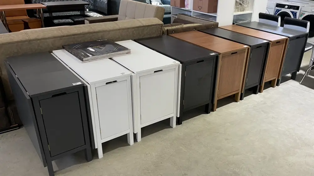 Masa plianta pentru 4 persoane este formata dintr-un blat fix cu dimensiunile 38 x 94 cm si doua blaturi laterale care se pliaza (59 x 94cm) si pot fi utilizate simultan. Astfel, prin ridicarea unui singur blat obtineti o masa cu lungimea de 97 cm, iar prin ridicarea ambelor blaturi, aceasta masa va avea lungimea totala de 156 cm.
