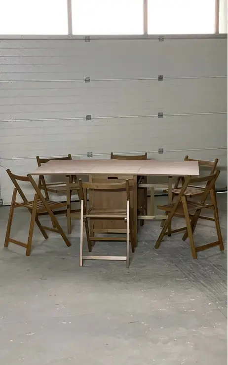 Mese si scaune pliante din lemn , ideale pentru bucatarie , living sau dormitor.