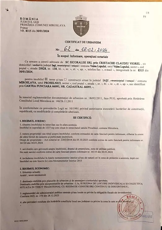 Teren intravilan cu suprafata de 1037 mp situat in Proselnici, com. Miroslava. Forma dreptunghiulara, topografie plana, cuu care de acces. Dispune de toate utilitatile pe teren: gaz, apa curenta, curent electric, canalizare. Posibilitate schimb cu garsoniera in Iasi.